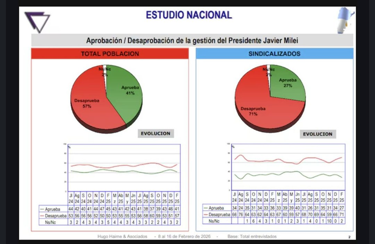El estudio, realizado entre el 27 de enero y el 2 de febrero sobre 2500 casos, ubica a Javier Milei con una imagen positiva del 42,8% y una negativa que ha escalado al 47,1%: se va consolidando su diferencial negativo.