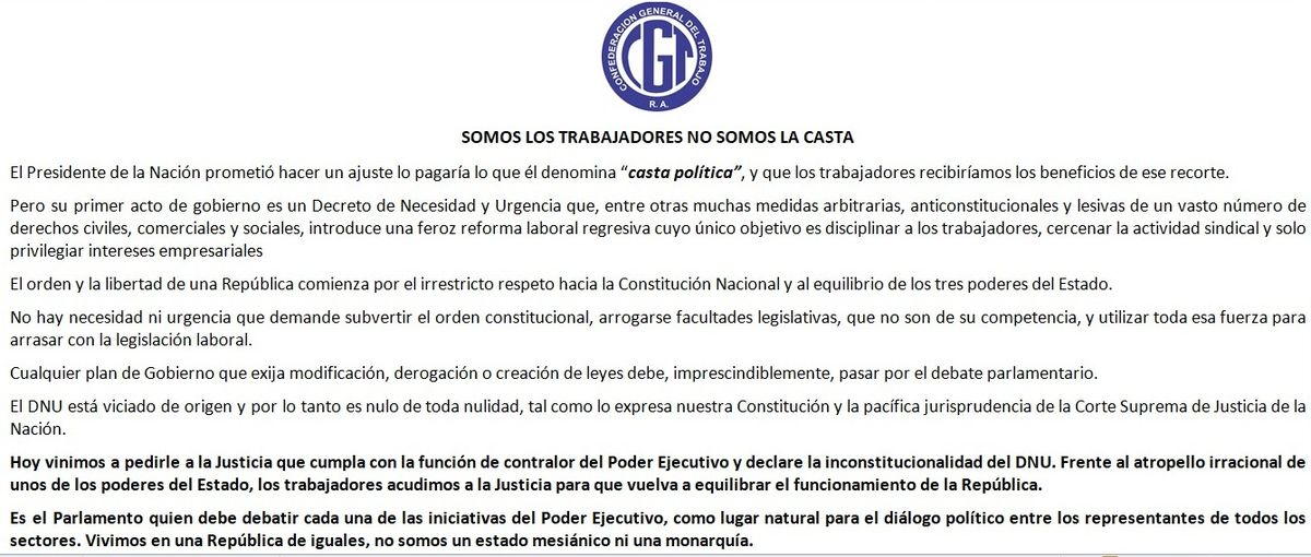 La convocatoria fue múltiple: CGT, las 2 CTA, Unidad Piquetera, Unión de Trabajadores y Trabajadoras de la Economía Popular (UTEP) y partidos de izquierda con la consigna "Abajo el DNU". La hora clave es 12:00 12 frente al Palacio de Justicia, en las calles Lavalle y Talcahuano, con el objetivo de acompañar la presentación judicial de la central obrera, y de otras medidas cautelaresque buscan frenar los alcances del DNU firmado por el presidente Javier Milei.
