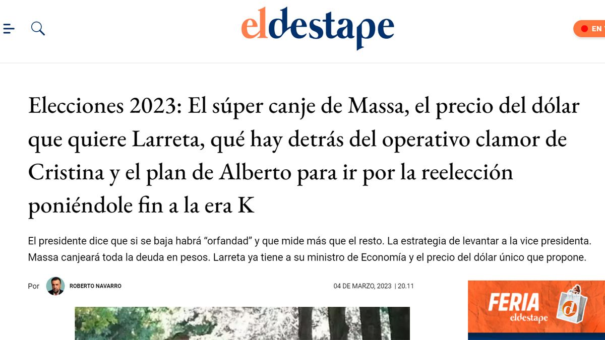 El Destape, con la firma de Navarro, publicó el fin de semana una nota citando declaraciones de Alberto Fernández respecto a las PASO. Cabe destacar que este lunes (06/03) dicho artículo sigue publicado en la web.
