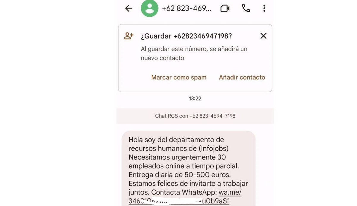 Como se puede observar en la imágen proporcionada por el periódico "Cinco Días", en la fecha de hoy 05/02, un usuario recibió un mensaje de "Infojobs" anunciando la búsqueda de colaboradores para una propuesta laboral sumamente atractiva. En dicha comunicación, se expresaba lo siguiente: "Hola soy del departamento de recursos humanos de (Infojobs) Necesitamos urgentemente 30 empleados online a tiempo parcial. Entrega diaria de 50-500 euros. Estamos felices de invitarte a trabajar juntos. Contacta WhatsApp".
