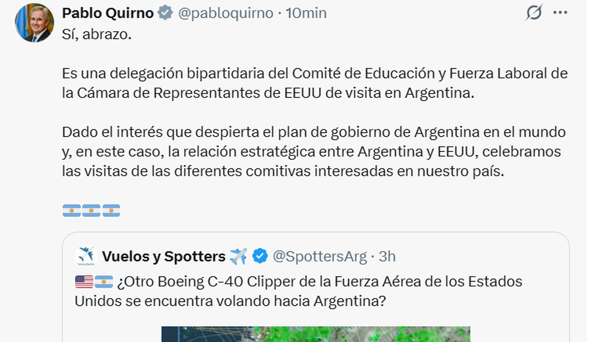 Ante la noticia que comenzó a difundirse por X, el canciller Pablo Quirno respondió por la misma vía y dio su explicación sobre el arribo de estos dos aviones de USA: "Es una delegación bipartidaria del Comité de Educación y Fuerza Laboral de la Cámara de Representantes de EEUU de visita en Argentina", aseguró.
