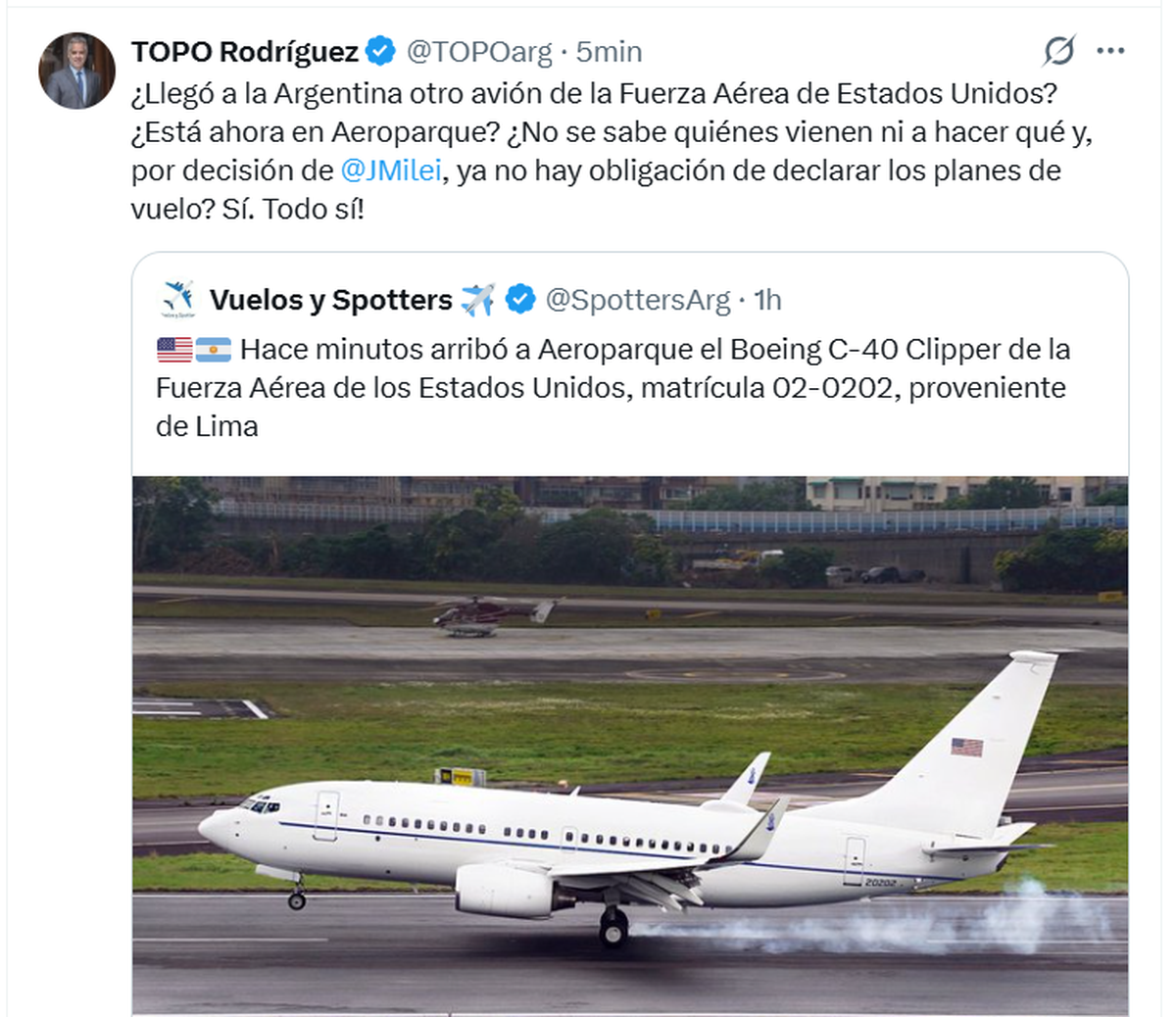 Alejandro 'Topo' Rodríguez, director del Instituto Consenso Federal, que viene siguiendo de cerca el caso, se hizo eco de la noticia en su cuenta de X: "¿Llegó a la Argentina otro avión de la Fuerza Aérea de Estados Unidos? ¿Está ahora en Aeroparque? ¿No se sabe quiénes vienen ni a hacer qué y, por decisión de Javier Milei ya no hay obligación de declarar los planes de vuelo? Sí. Todo sí!"