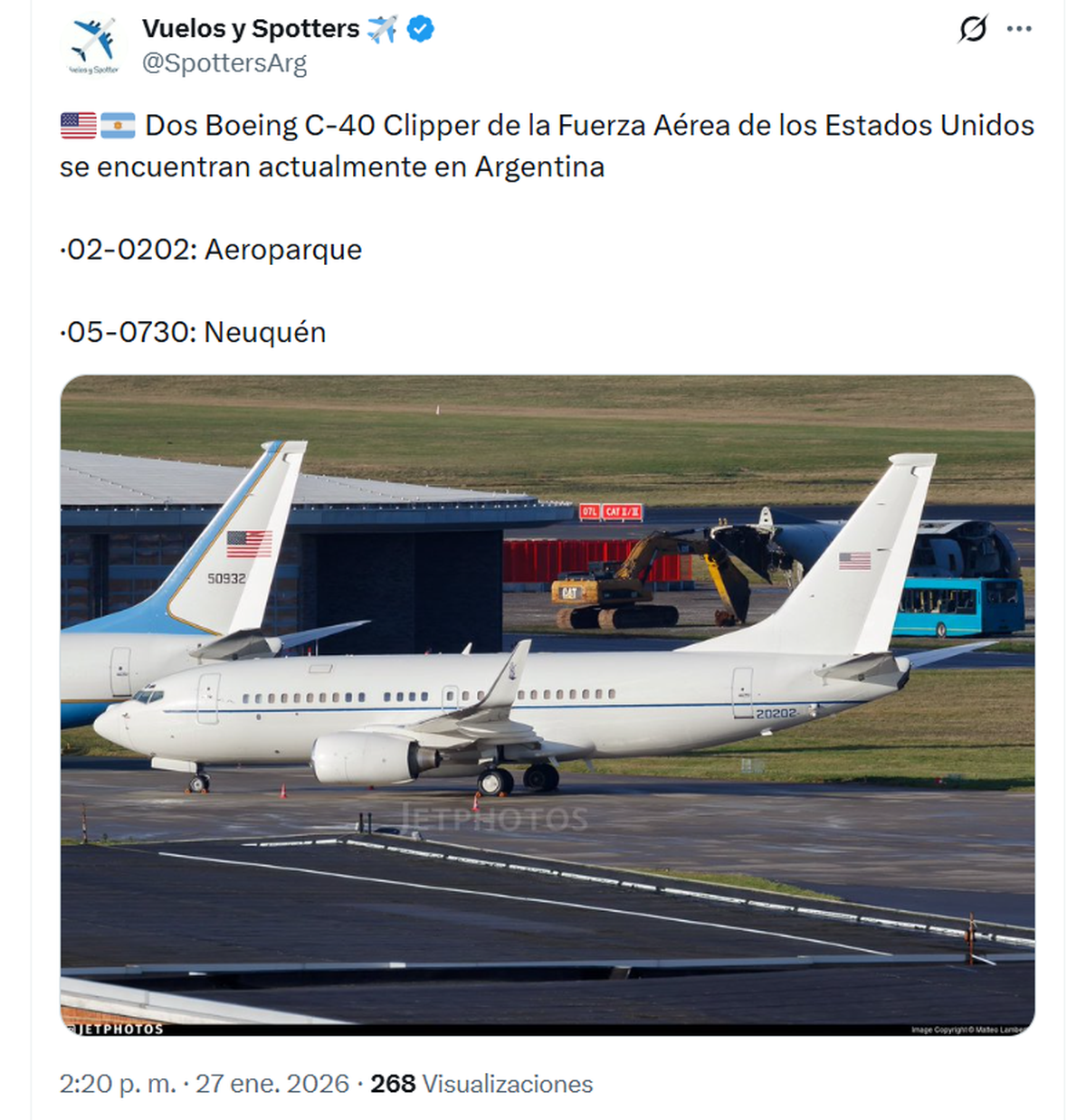 La novedad fue dada a conocer por la cuenta especializada de X Vuelos y Spotters, que informó que "Dos Boeing C-40 Clipper de la Fuerza Aérea de los Estados Unidos se encuentran actualmente en Argentina". Uno aterrizó en Aeroparque y otro en Neuquén.