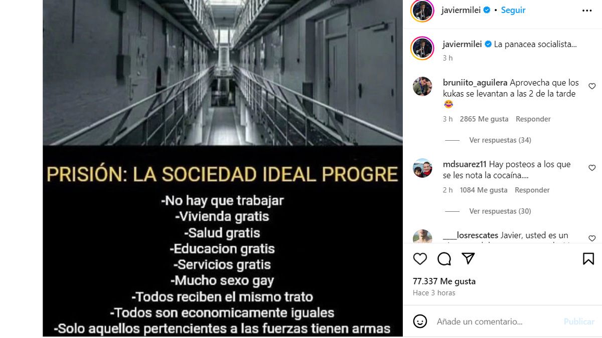 "La panacea socialista", escribió el mandatario, junto a la imagen de una cárcel que dice "Prisión: la sociedad ideal progre". En ella, se enumeran algunos ítems de esta 'prisión' del socialismo: "no hay que trabajar, vivienda gratis, salud gratis, educación gratis, servicios gratis, mucho sexo gay , todos reciben el mismo trato, todos son económicamente iguales, solo aquellos pertenecientes a las fuerzas tienen armas".