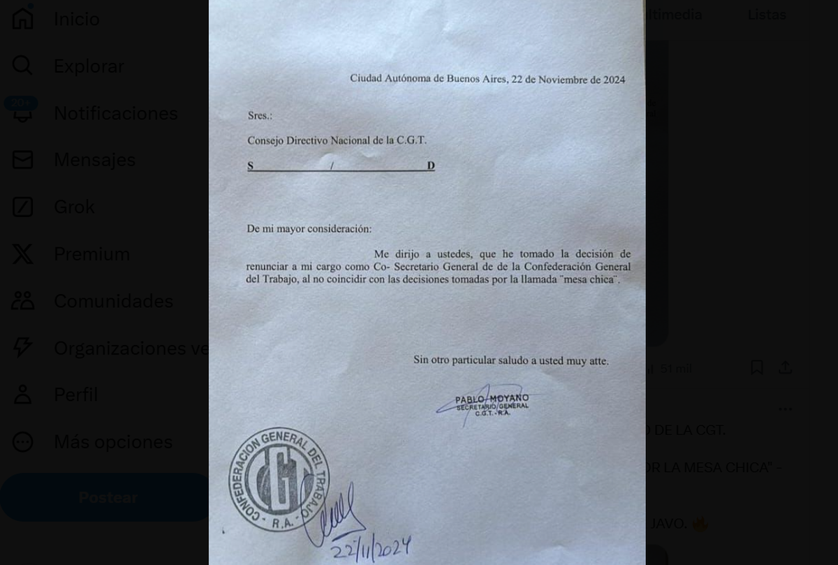 Pablo Moyano renunció este viernes (22/11) a su cargo de Co-Secretario de la CGT por "no coincidir con las decisiones tomadas por la 'mesa chica'", la cual viene manteniendo una postura dialoguista con el Gobierno de Javier Milei. Así lo anunció en un escueto mensaje dirigido a las autoridades de la central obrera.