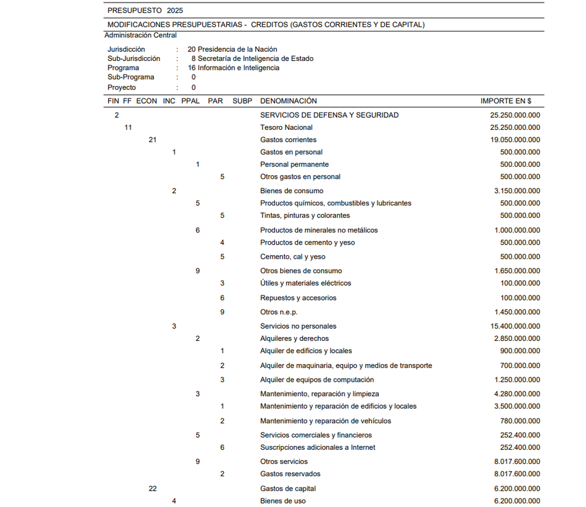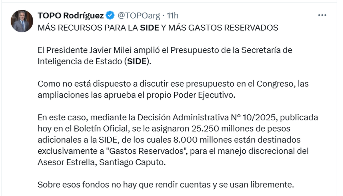 Uno de los puntos más sensibles de la Decisión Administrativa es la ampliación del presupuesto de la Secretaría de Inteligencia de Estado (SIDE), que pasó a depender directamente de la Presidencia de la Nación. Según el texto publicado, se le asignaron $25.250 millones adicionales, de los cuales $8.000 millones están destinados a "Gastos Reservados", es decir, que no requiere rendición de cuentas ni justificación de destino, permitiendo su uso totalmente discrecional.