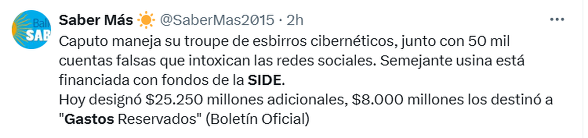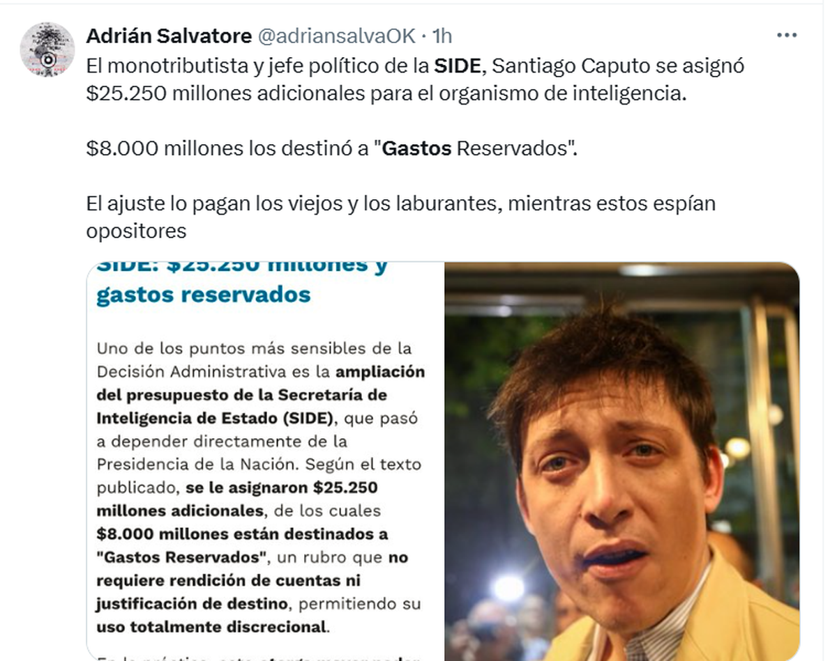 El Gobierno de Javier Milei oficializó este lunes (05/05) una nueva ampliación del Presupuesto que incluye $25.250 millones adicionales para la SIDE (de los cuales $8.000 millones están destinados a "Gastos Reservados").