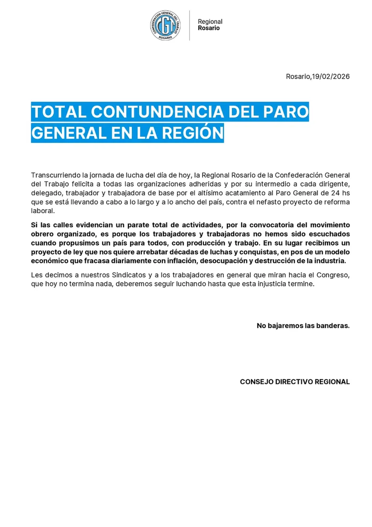 A raíz de un escenario movido, la CGT Rosario evaluó la medida de fuerza en la ciudad y región. Por medio de un comunicado, expresó que fue "de total contundencia el paro". En ese sentido, la central obrera felicitó a todas las organizaciones adheridas y por su intermedio a cada dirigente, delegado, trabajador y trabajadora de base por el "altísimo acatamiento".
