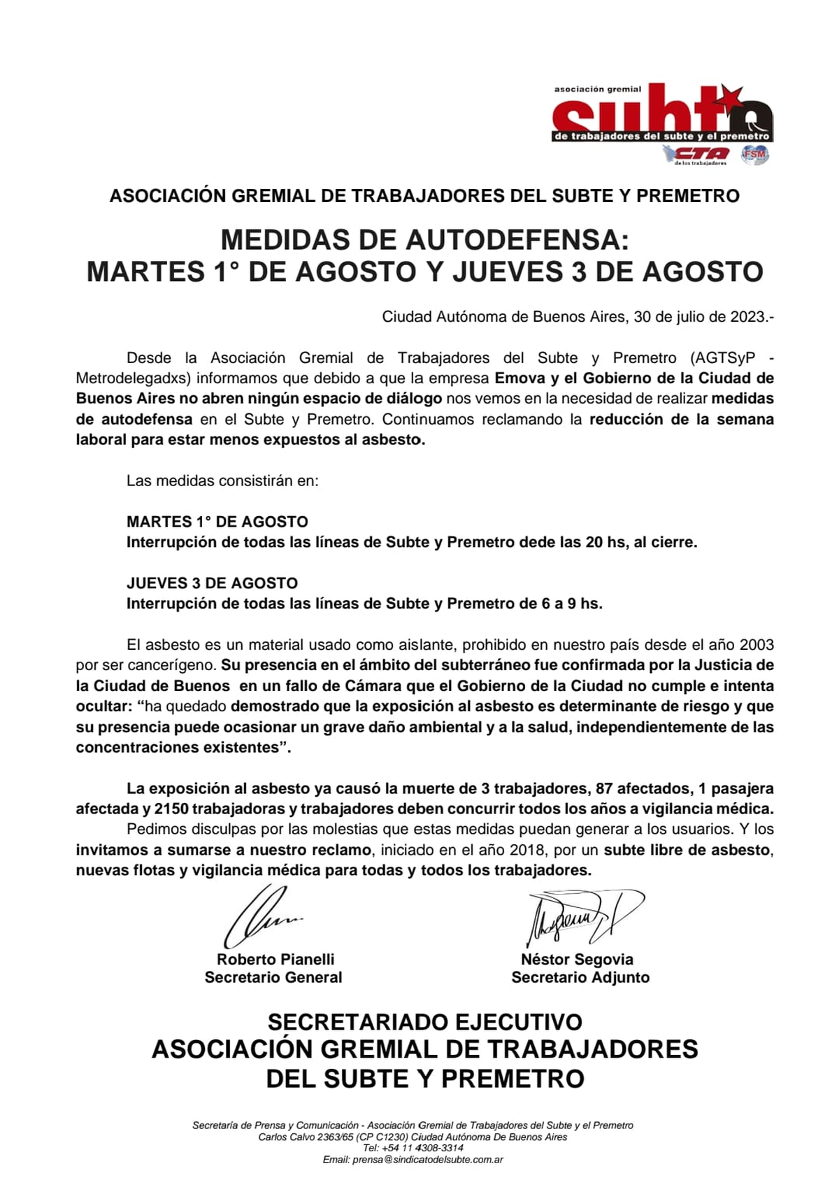 A pesar de que el mes de agosto aún no ha iniciado plenamente, los hechos ya evidencian que este nuevo período será agitado e intenso. Un claro ejemplo de esta situación se materializó este domingo, cuando la Asociación Gremial de Trabajadores del Subte y Premetro (AGTSyP), estableció mediante un comunicado, llevar a cabo dos paros de subte durante la semana en curso, fijados para el martes 1° y el jueves 3 de agosto. Ambos con un alcance simultáneo que abarcará todas las líneas del servicio de transporte subterráneo.