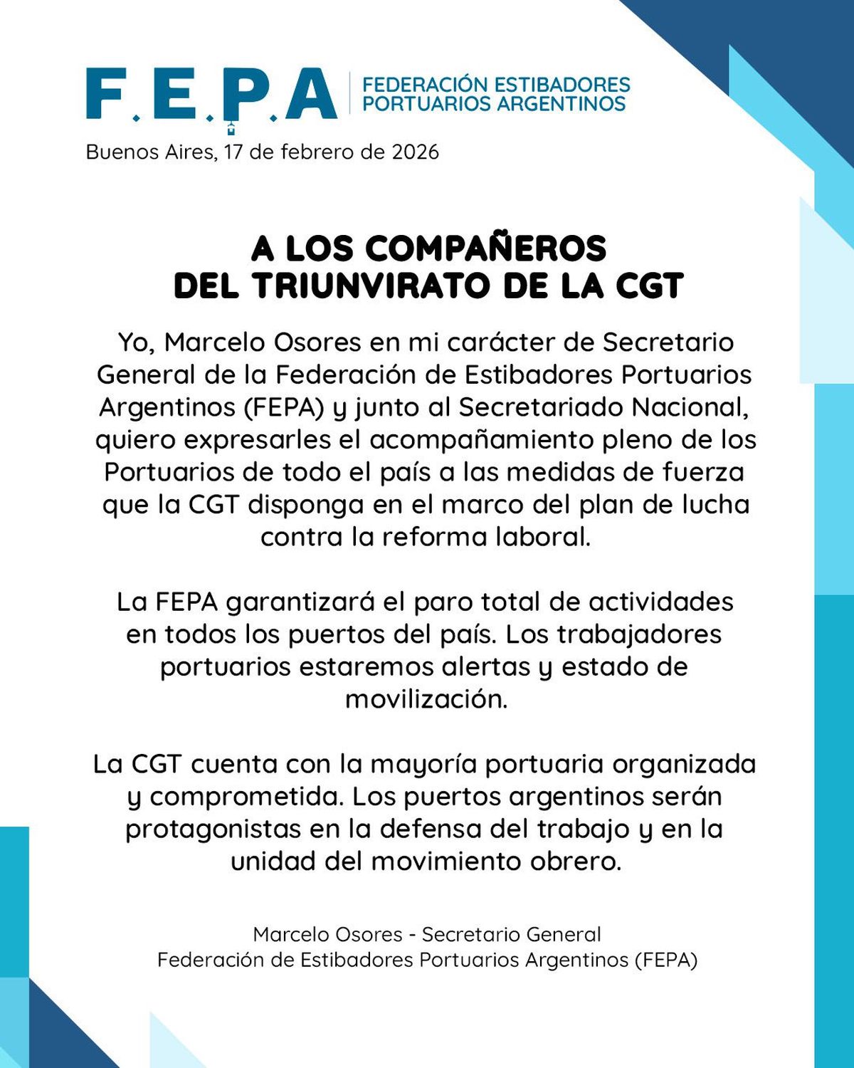 Marcelo Osores envió una carta dirigida al Triunvirato de la CGT en la que expresó, en primera persona y en nombre de la conducción nacional, el acompañamiento pleno de los trabajadores portuarios al plan de lucha.