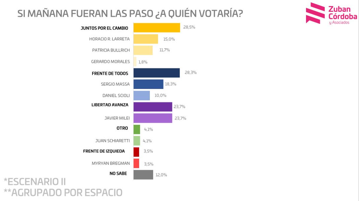 En el 2do escenario se achican las ofertas de las principales coaliciones y también su intención de voto. Esto afecta principalmente al oficialismo, que cae hasta el 28,3% y ahora queda debajo de JxC (28,5), aunque en situación de empate. Milei conserva el caudal del escenario previo, incluso con una pequeña suba. Los indecisos suben hasta el 12%.