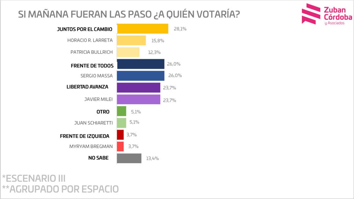 El 3er escenario presenta a Sergio Massa como candidato único del espacio, y si bien consigue ser el candidato individual más votado, no llega a retener la intención de voto oficialista de los escenarios anteriores al caer hasta el 26%. Con ese guarismo, el FdT se ubica detrás de JxC (28,1%). Milei, en tanto, se mantiene dentro del umbral de los 23 puntos. Los indecisos son el 13,2%.