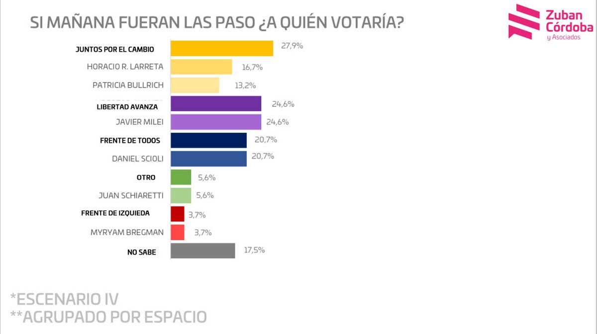 El escenario 4 presenta un candidato único del oficialismo, esta vez Daniel Scioli, que sufre una sangría mayor y reduce la intención de voto del FdT hasta los 20,7%, con lo que lo deja en 3er lugar, detrás de Milei, que suma hasta el 24,6%. JxC lidera con el 29,9%. Scioli, no obstante, es aquí el 2do candidato individual más votado. Este escenario es el que más indecisos presenta: 17,5%.