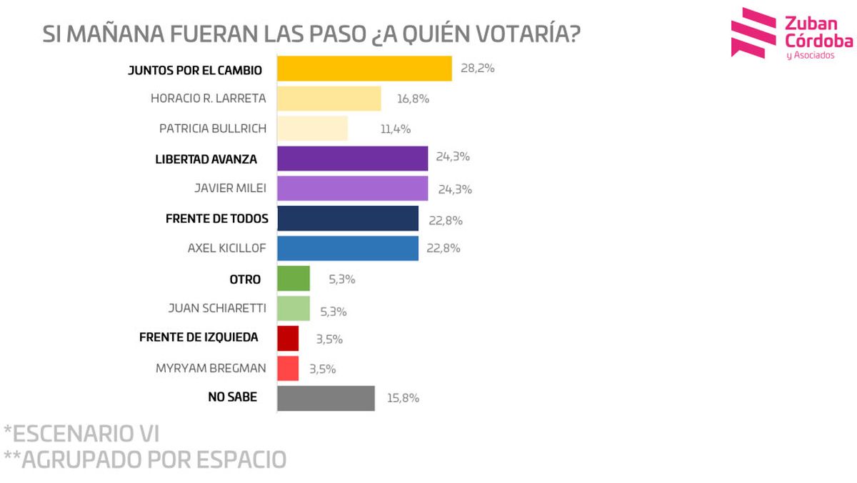 La encuesta de Zuban-Córdoba consta de 1.300 casos efectivos recolectados a nivel nacional de forma domiciliaria entre el 26/05 y el 01/06. El margen de error es de +/-2,72%.