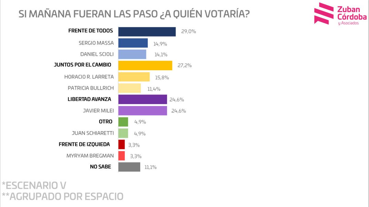 En el primero de ellos, se observa que una PASO oficialista concentra una mayor intensión de voto a medida que más precandidatos incluye. Asi, con 5 opciones (Massa, 'Wado' de Pedro, Daniel Scioli, Juan Grabois y Agustín Rossi), el FdT logra 31,3% y se convierte en el espacio más votado, seguido de Juntos por el Cambio (29,3%, también con 5 opciones) y de La libertad avanza, que con un 23% convierte a Javier Milei en el candidato individual más votado. Esta hipotesis es la que menos indecisos tiene: 9%.