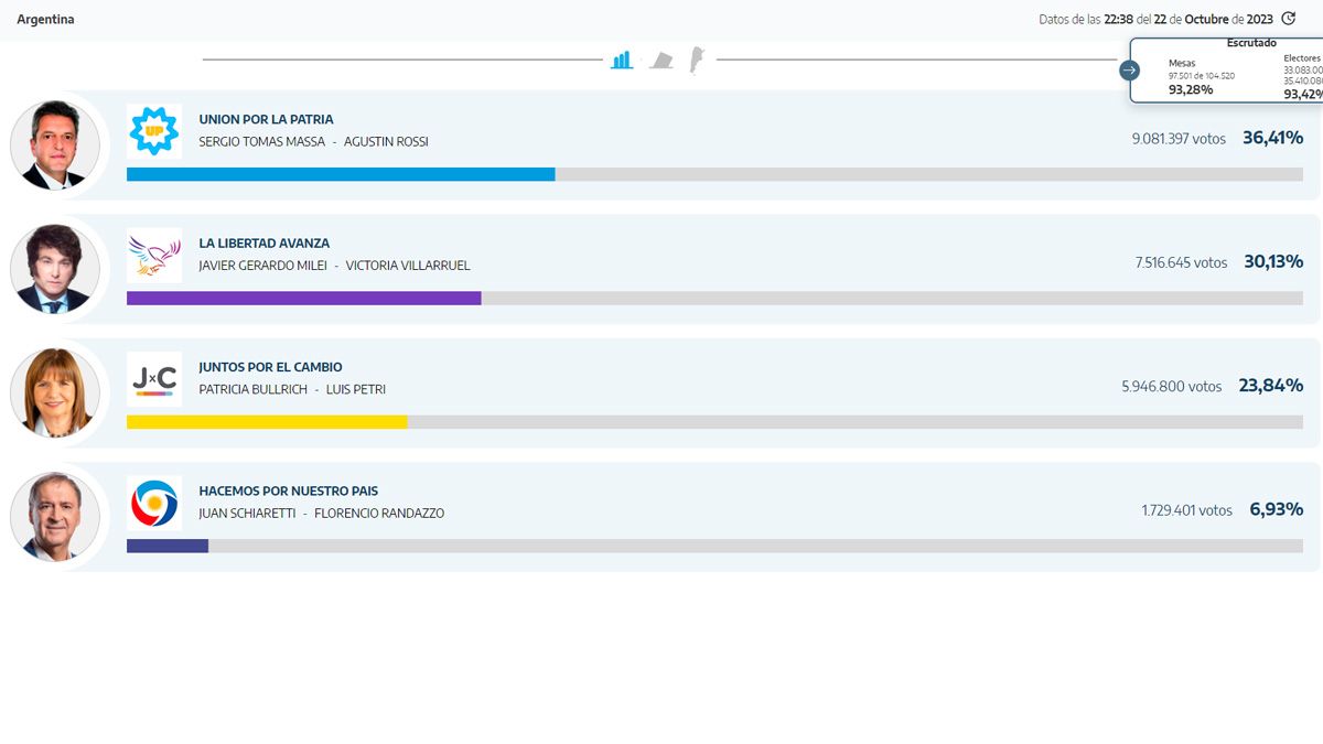 Con el 93,28% de las mesas escrutadas, Sergio Massa lidera con el 36,41% de los votos, seguido por Javier Milei (30,13%) y luego Patricia Bullrich (23,84%).