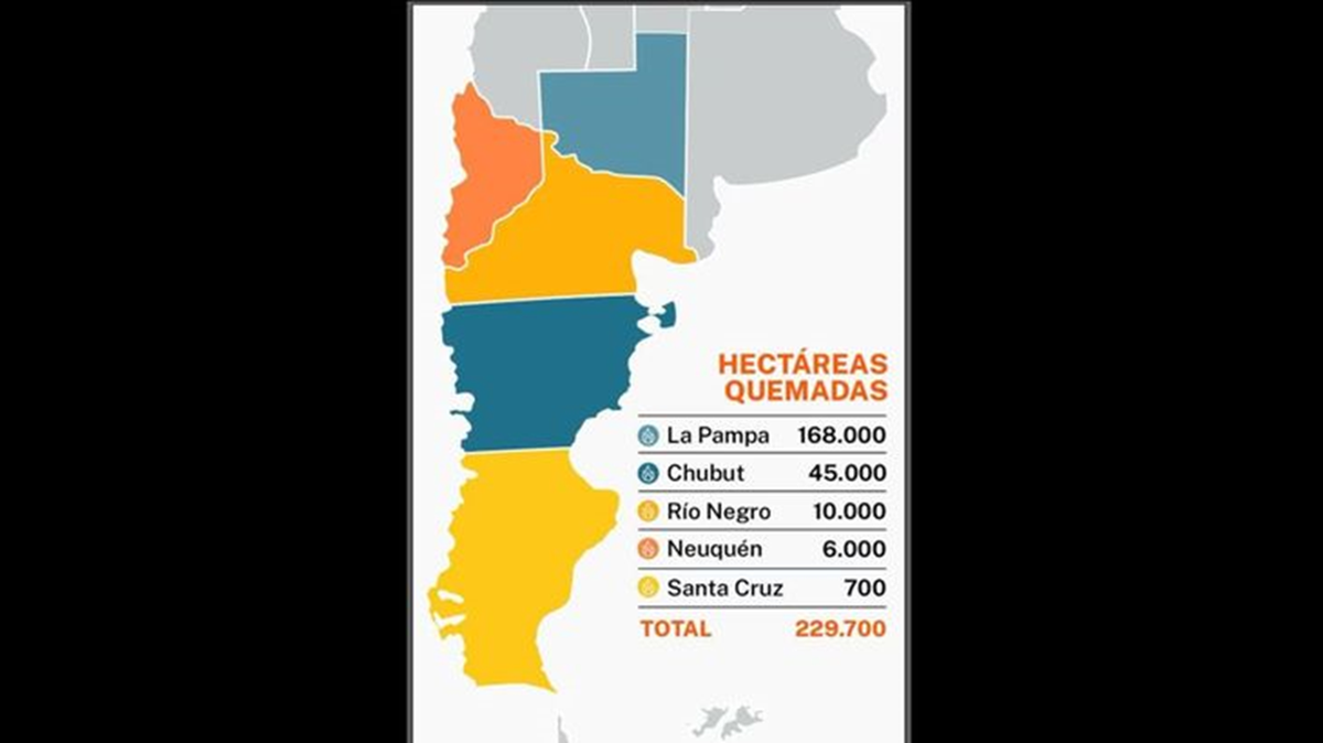 En los últimos meses, la provincia de La Pampa registró más de 168.000 hectáreas quemadas, Chubut 45.000, Río Negro 10.000, Neuquén 6.000 y Santa Cruz 700 hectáreas de tierras y biomasa arrasadas.