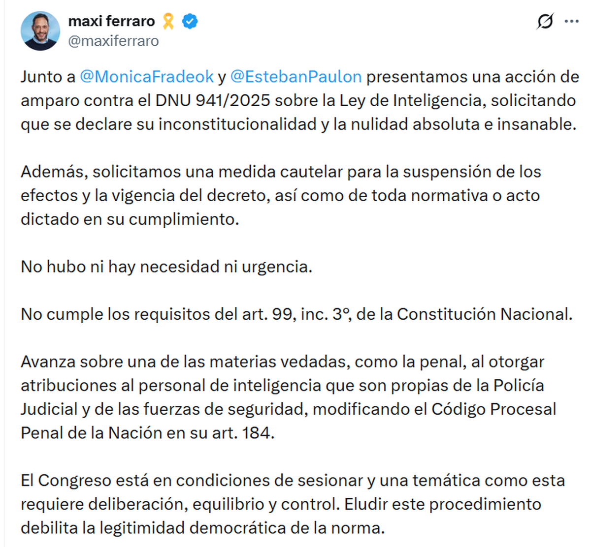 Los diputados nacionales Maximiliano Ferraro, Mónica Frade y Esteban Paulón presentaron este lunes (05/01) una “acción de amparo” para que la Justicia declare la “inconstitucionalidad” y la “nulidad absoluta” del DNU 941/2025, que modifica la Ley Nacional de Inteligencia.