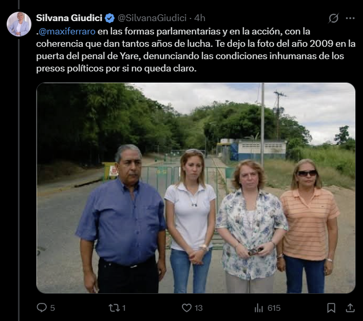 La discusión continuó con un nuevo posteo de Giudici, quien sumó una fotografía de su visita al penal de Yare, tomada hace 17 años, como prueba de coherencia política. “En las formas parlamentarias y en la acción, con la coherencia que dan tantos años de lucha”, escribió, reforzando su posición con el archivo.