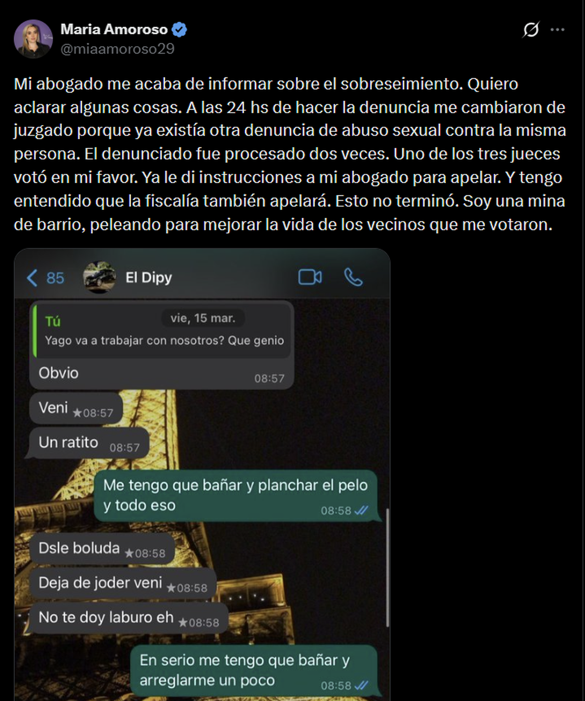 También dejó en claro que la disputa judicial continuará: “Ya le di instrucciones a mi abogado para apelar. Y tengo entendido que la fiscalía también apelará. Esto no terminó”. En ese mismo mensaje, se definió como “una mina de barrio, peleando para mejorar la vida de los vecinos que me votaron”.