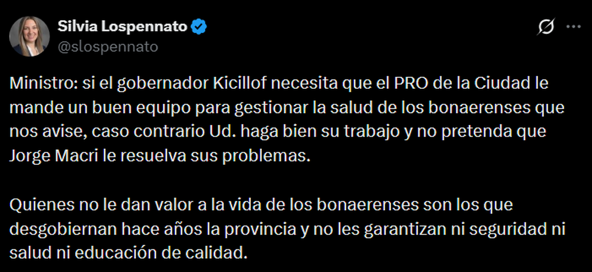 Las declaraciones no tardaron en generar respuestas desde el oficialismo porteño. Dirigentes del PRO cerraron filas en defensa de Jorge Macri y cuestionaron duramente la gestión sanitaria del gobierno bonaerense. Una de las primeras en salir al cruce fue la diputada Silvia Lospennato, quien le reclamó a Kreplak que se haga cargo de los problemas estructurales de la provincia en lugar de responsabilizar a la Ciudad.