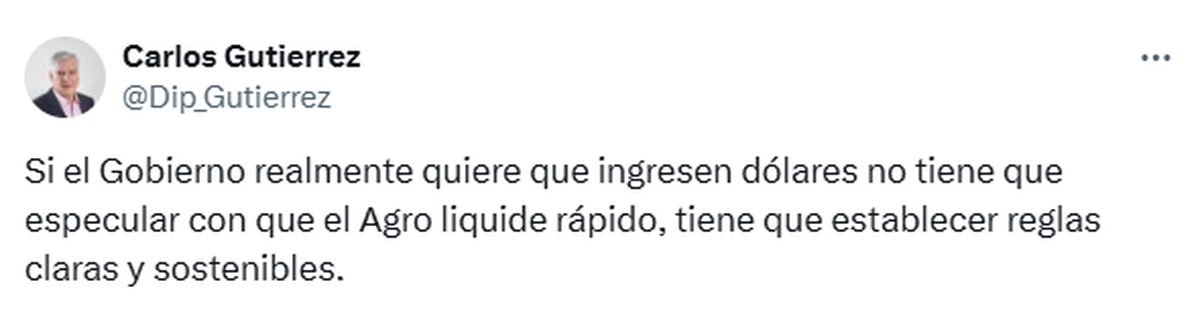 Por otro lado, en su cuenta de X, el diputado Gutiérrez escribió: "Si el Gobierno realmente quiere que ingresen dólares, no tiene que especular con que el agro liquide rápido; tiene que establecer reglas claras y sostenibles".