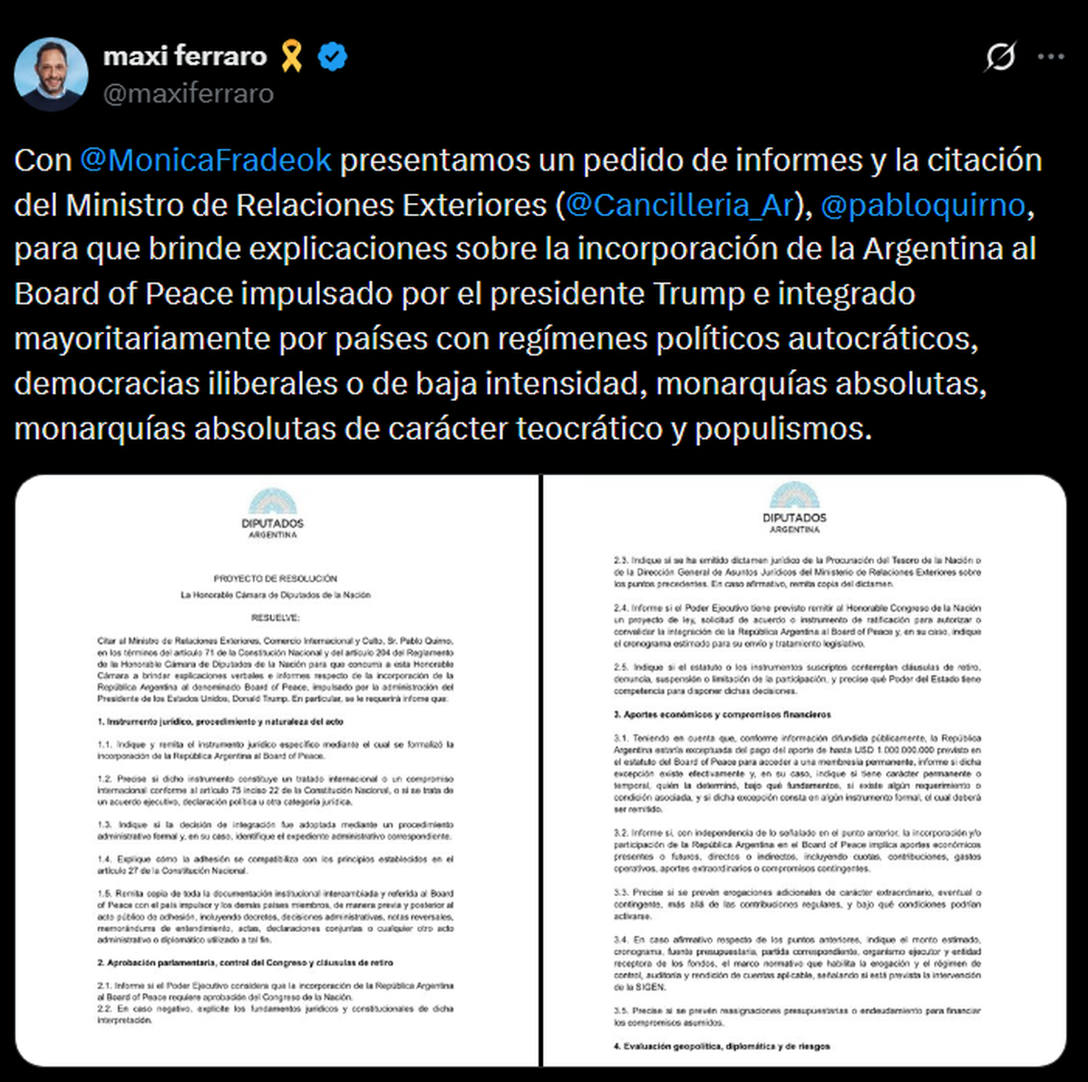 Otro de los ejes del planteo apunta al rol del Congreso. En ese sentido, Ferraro y Frade preguntaron si el Gobierno considera que la adhesión requiere aprobación legislativa y, en caso contrario, que explique cuáles son los fundamentos jurídicos y constitucionales para avanzar sin ese aval. Además, pidieron saber si el Ejecutivo tiene previsto enviar un proyecto de ley para ratificar o convalidar la integración al Board of Peace.