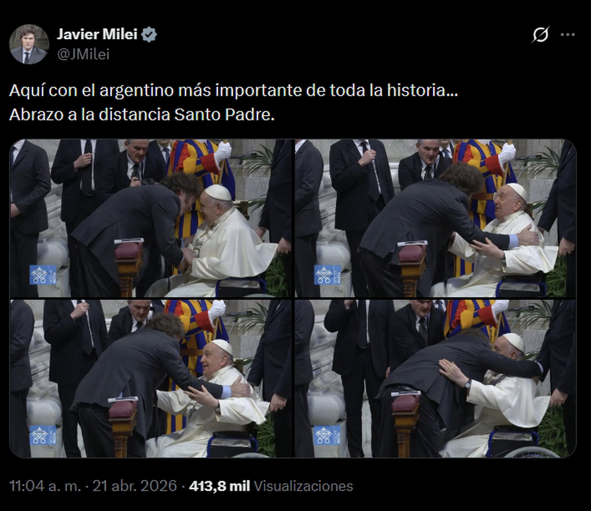 A través de su cuenta en la red social X, Milei publicó una serie de imágenes de un encuentro que mantuvo con el Sumo Pontífice y le dedicó unas palabras cargadas de reconocimiento: “Abrazo a la distancia Santo Padre”.