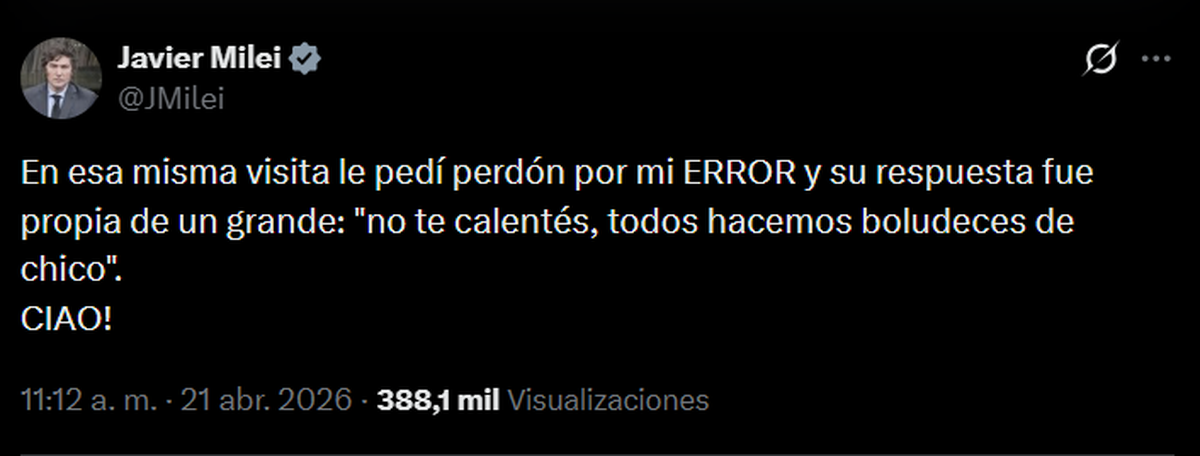 En otra publicación, relató el momento en el que le pidió disculpas al Papa por declaraciones pasadas en su contra. Según contó, la reacción de Francisco fue directa y descontracturada: