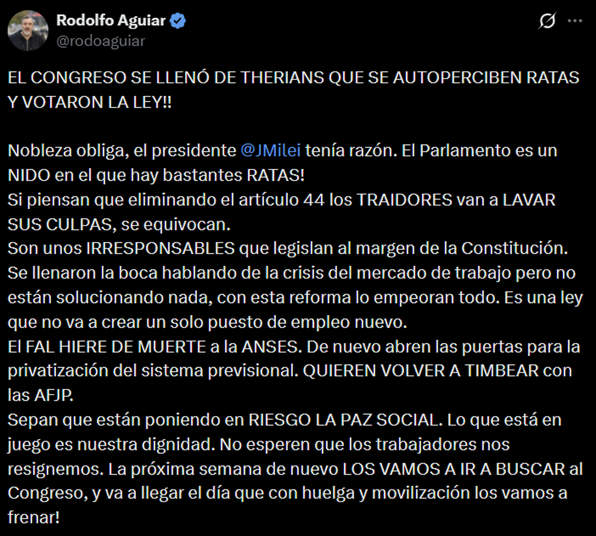 “El Congreso se llenó de therians que se autoperciben ratas y votaron la ley”, escribió.