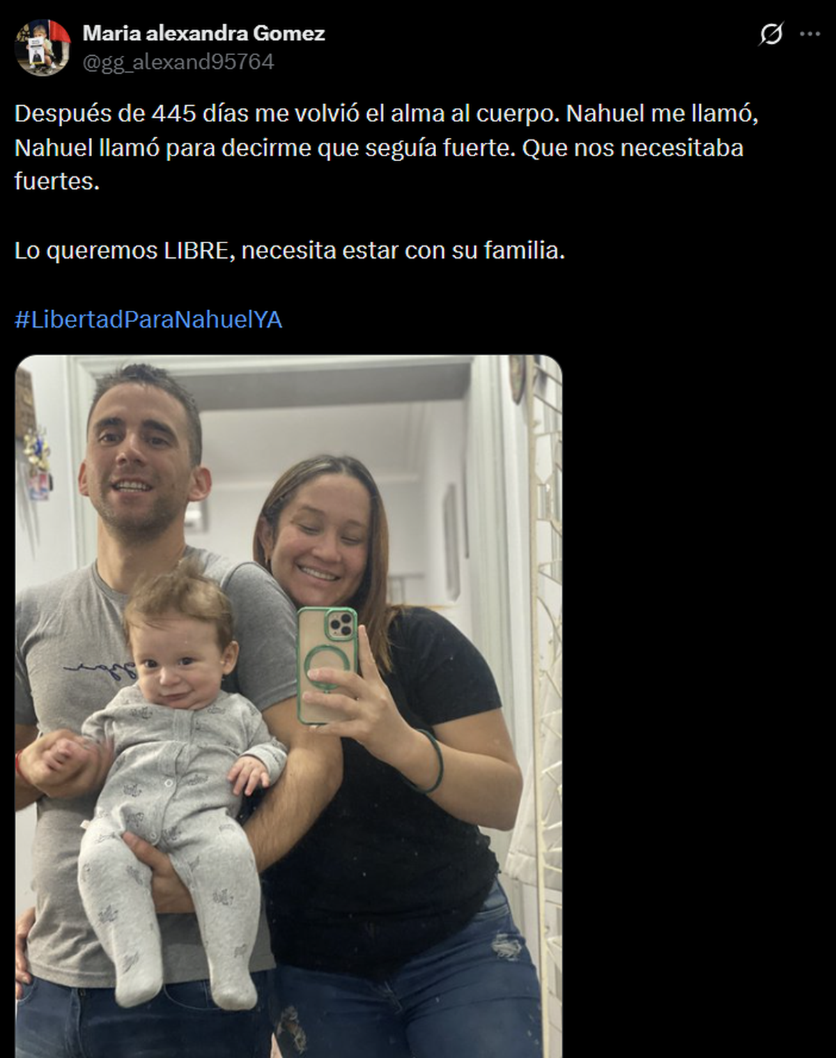 “Después de 445 días me volvió el alma al cuerpo. Nahuel me llamó, Nahuel llamó para decirme que seguía fuerte. Que nos necesitaba fuertes. Lo queremos LIBRE, necesita estar con su familia”.