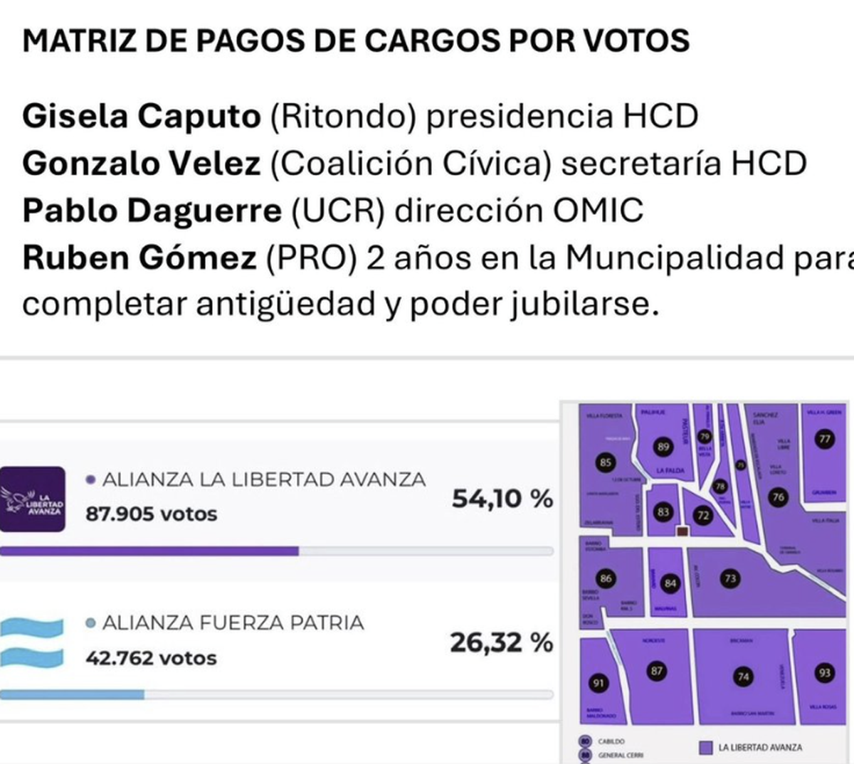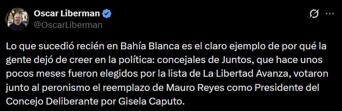 Para Liberman, lo ocurrido simboliza “por qué la gente dejó de creer en la política”, al sostener que concejales electos con la boleta de LLA actuaron “en beneficio propio” al votar junto al oficialismo. En un mensaje que generó fuerte repercusión, afirmó que el PRO y el peronismo “están haciendo negocios como si la Municipalidad fuera un botín”.