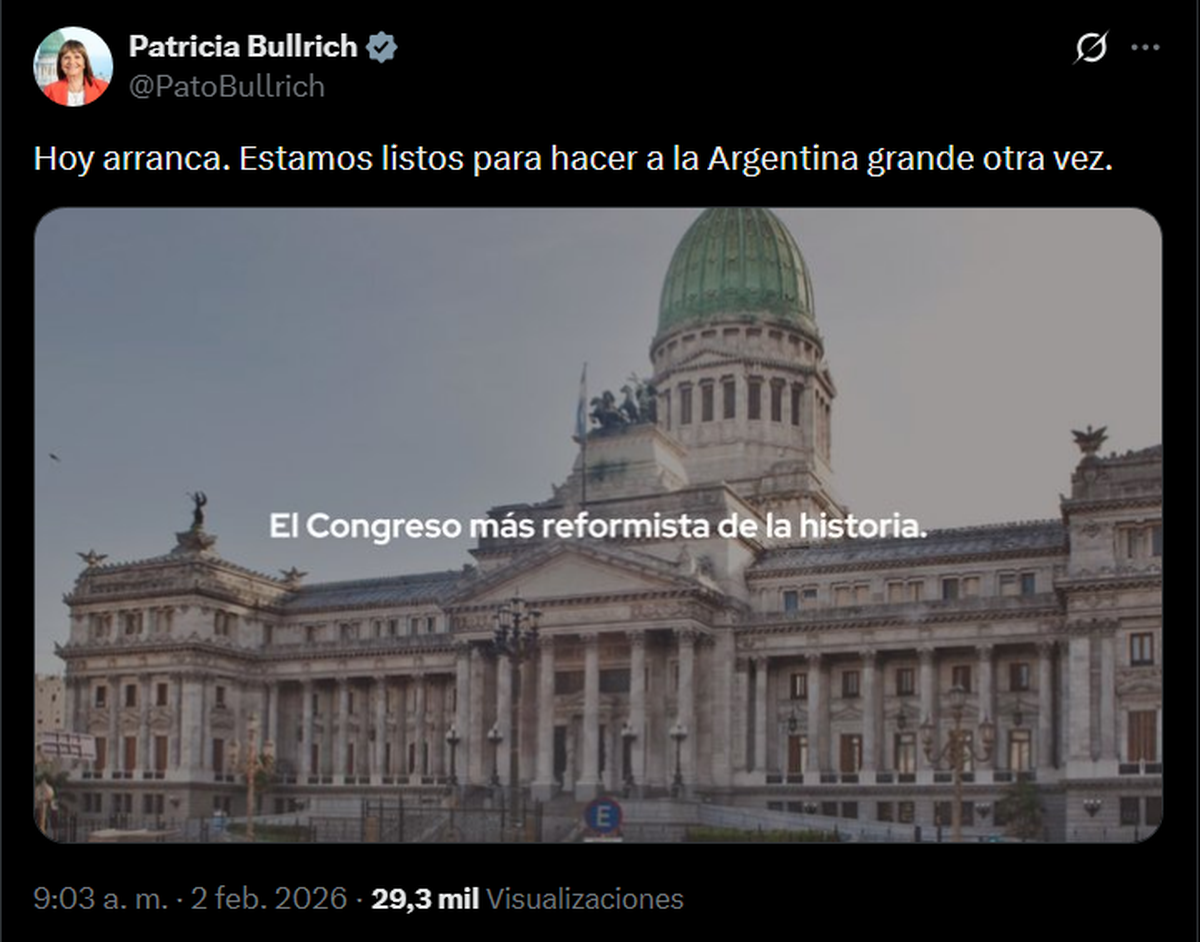 En ese contexto, la jefa de bloque de La Libertad Avanza en el Senado, Patricia Bullrich, salió a marcar la cancha en la previa del inicio de las sesiones. A través de redes sociales, aseguró que el oficialismo está “listo para hacer a la Argentina grande otra vez” y definió al actual Congreso como “el más reformista de la historia”.