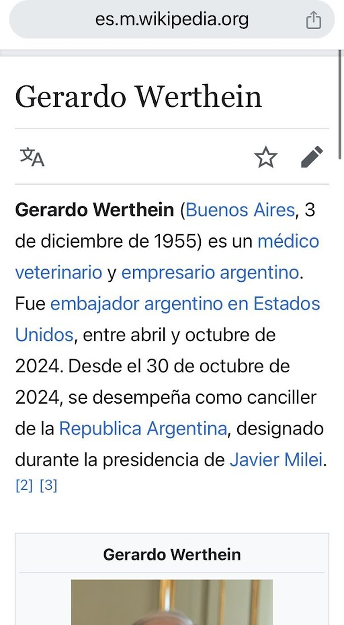 Por su parte, sin perdida de tiempo, el nuevo canciller actualizó sus datos en Wikipedia
