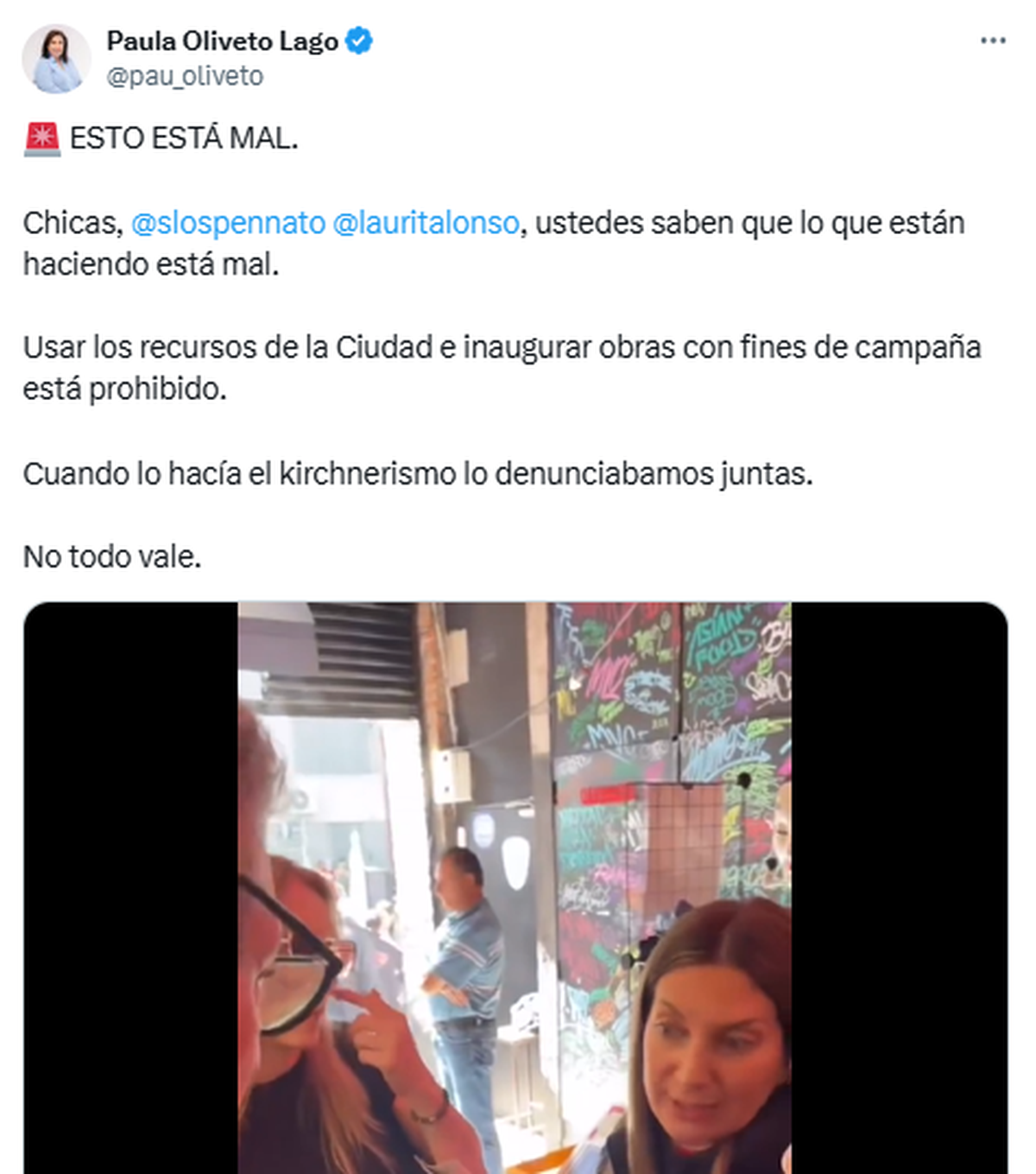 Las críticas no tardaron en llegar. La diputada de la CC Paula Oliveto utilizó su cuenta en X (ex Twitter) para señalar que “usar los recursos de la Ciudad e inaugurar obras con fines de campaña está prohibido”. Y agregó: “Cuando lo hacía el kirchnerismo lo denunciábamos juntas”.