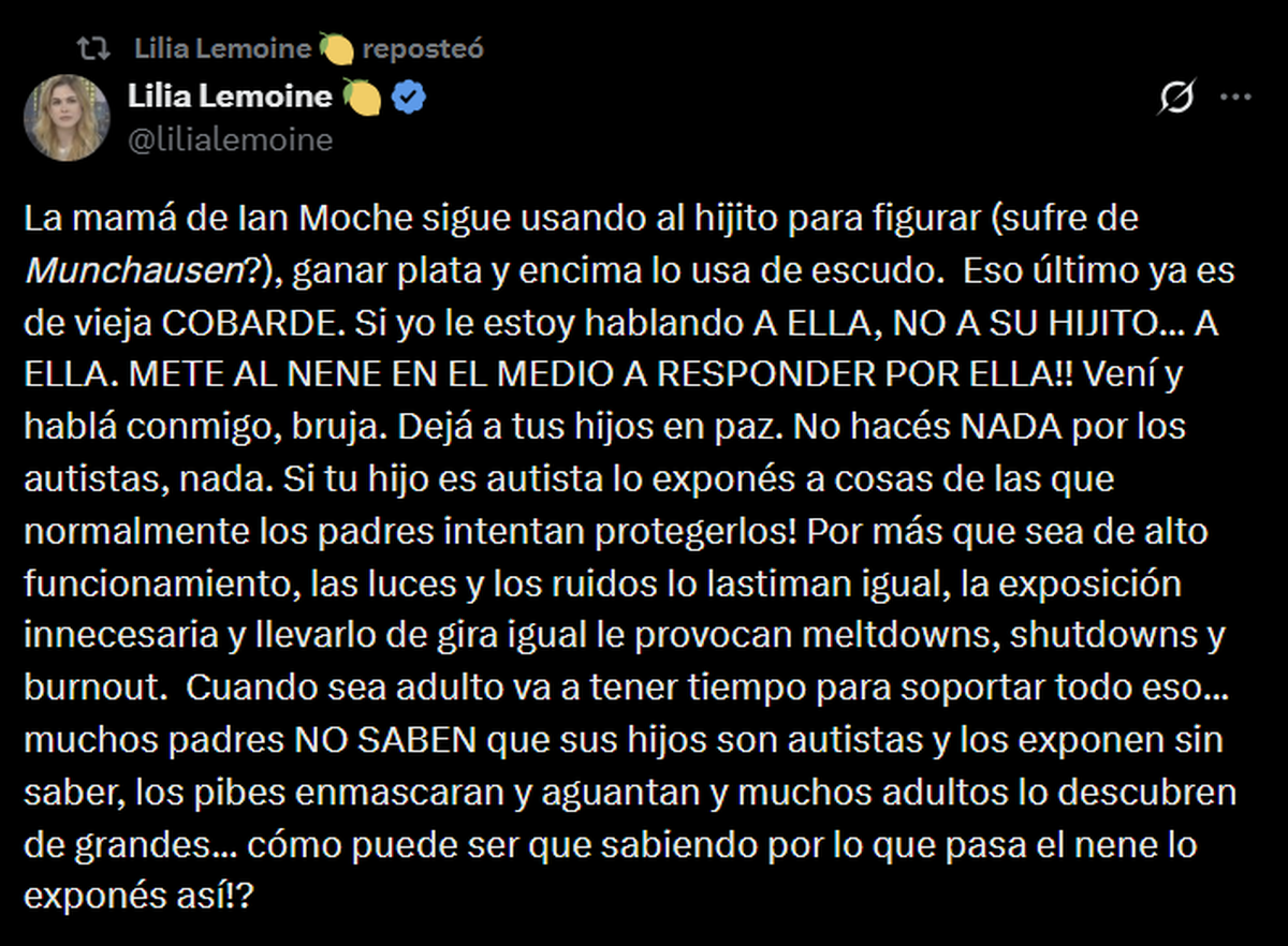 En su publicación, Lemoine sostuvo que la madre del niño “lo usa para figurar y ganar plata”, sugirió la existencia de un supuesto “síndrome de Munchausen” y la acusó de exponerlo de manera irresponsable. Aunque insistió en que sus críticas estaban dirigidas “a la madre y no al hijo”, el mensaje incluyó referencias explícitas al impacto que —según su mirada— la exposición pública tendría sobre el niño por su condición dentro del espectro autista.