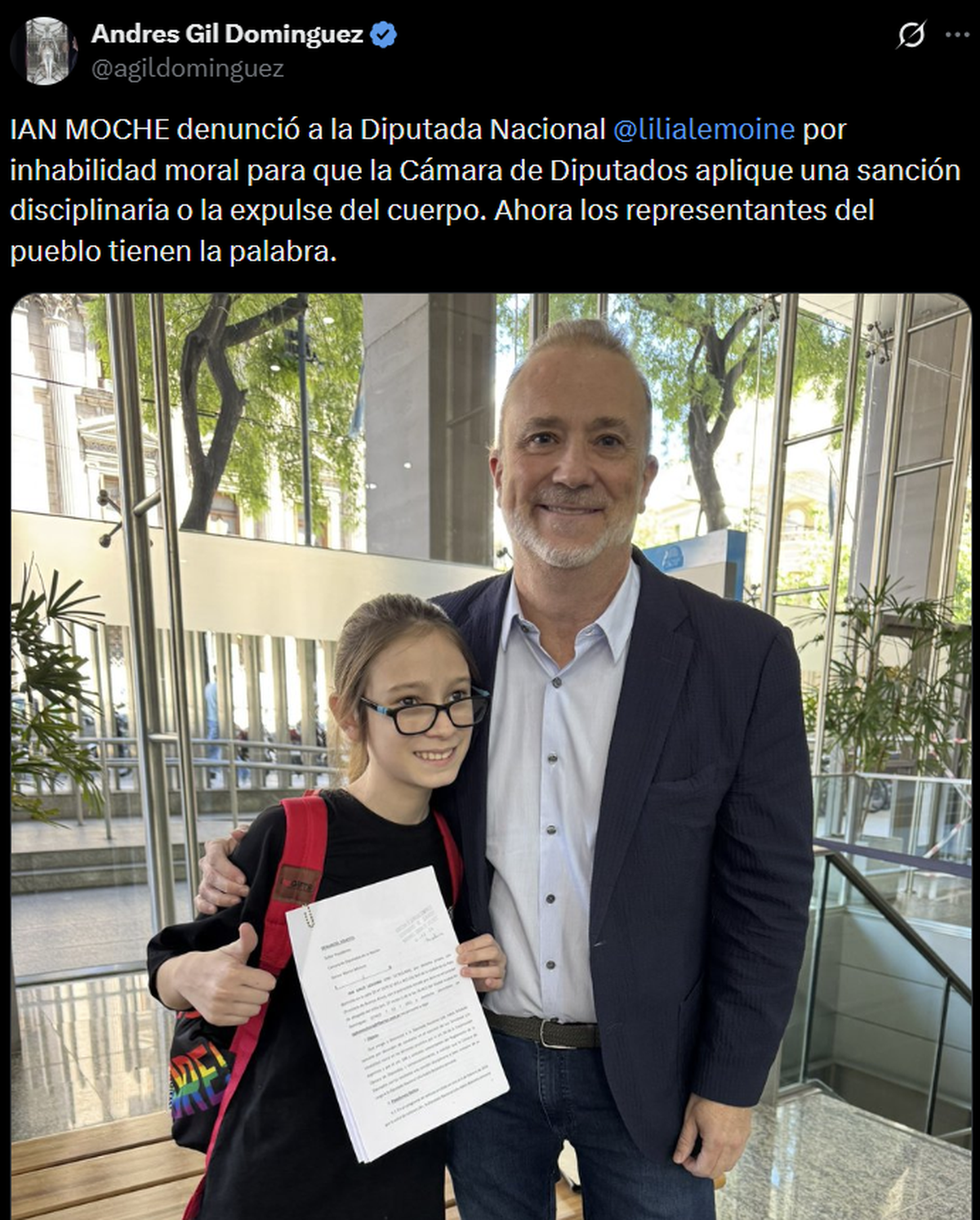 Asimismo, en medio de la polémica, Ian Moche presentó una denuncia formal contra la diputada nacional Lilia Lemoine por presunta inhabilidad moral, con el objetivo de que la Cámara de Diputados de la Nación evalúe la aplicación de una sanción disciplinaria o, en su defecto, su expulsión del cuerpo legislativo. La presentación apunta a que el Congreso analice si las expresiones de la legisladora vulneran los estándares éticos y de conducta exigidos a los representantes públicos.