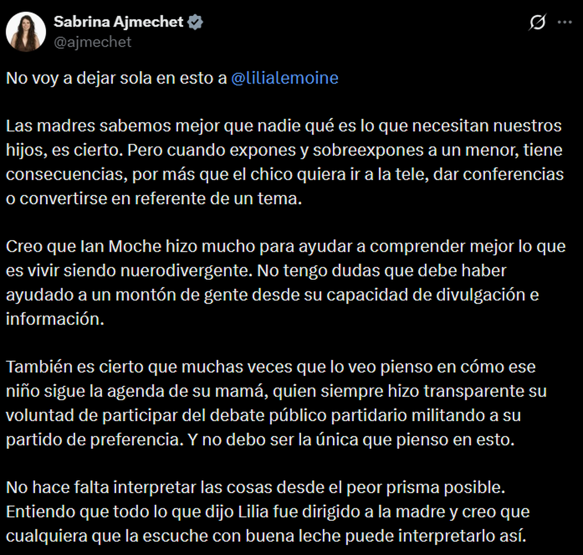 Ajmechet reconoció el trabajo de Ian Moche en la divulgación sobre neurodivergencias y afirmó que “ayudó a mucha gente”, pero planteó que el rol de la madre en la agenda pública del niño merece ser discutido. Para la diputada, los dichos de Lemoine estuvieron dirigidos a la adulta responsable y no al menor, y consideró que una lectura “con buena fe” permitiría entenderlo de ese modo.