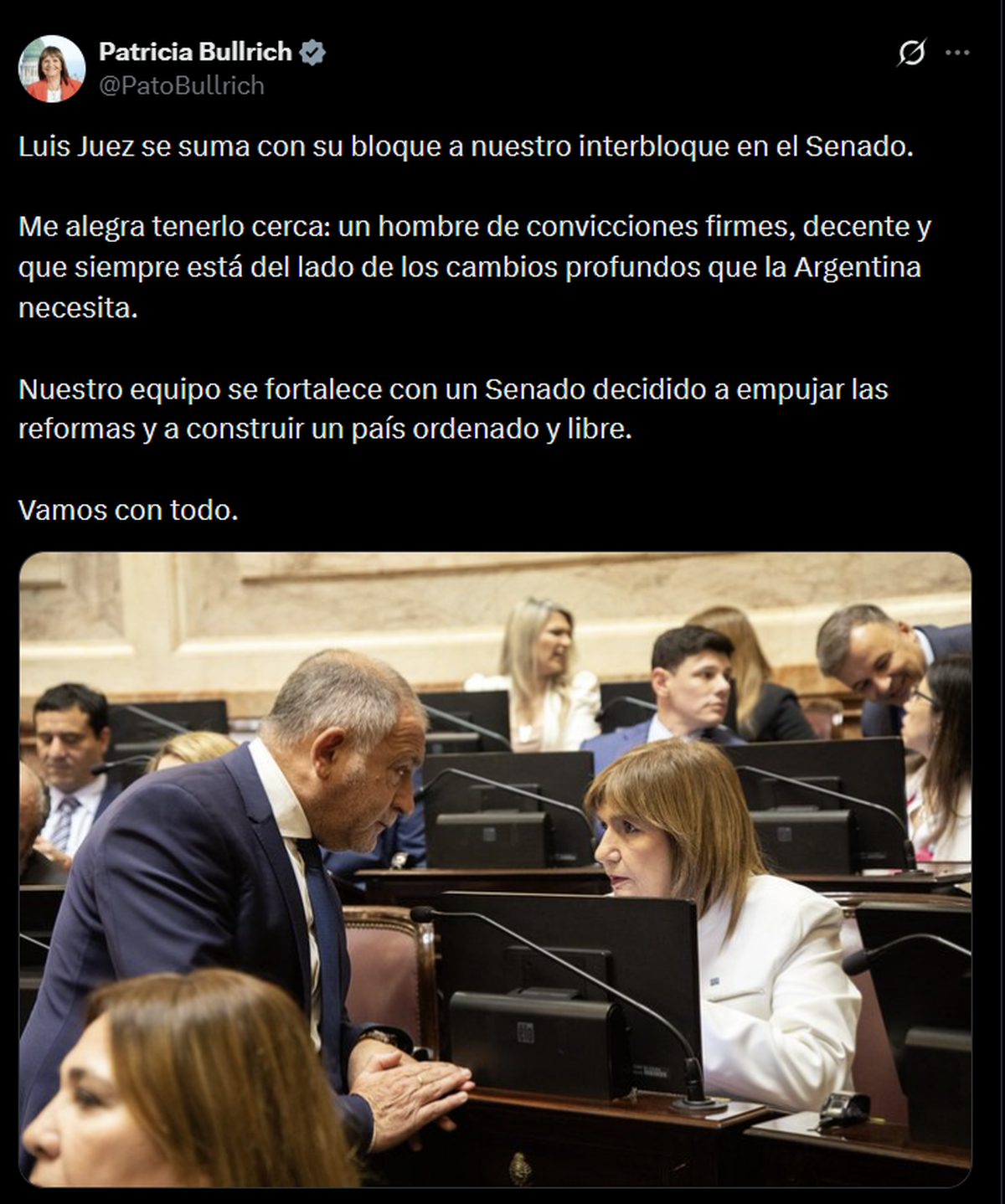 El senador nacional Luis Juez pasó a integrar el interbloque de La Libertad Avanza en el Senado. Patricia Bullrich lo anunció en X.