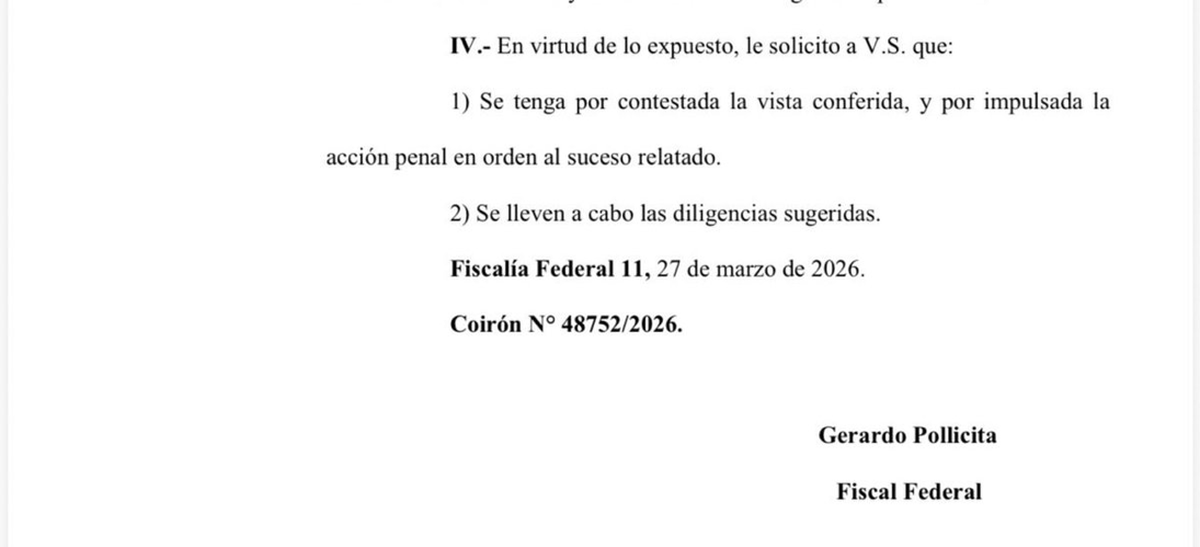 El fiscal Gerardo Pollicita requirió al juez federal Ariel Lijo la adopción de una serie de medidas de prueba en la investigación por enriquecimiento ilícito que involucra al jefe de Gabinete Manuel Adorni, tras la denuncia originada por el vuelo realizado a Punta del Este junto a su familia y al periodista Marcelo Grandio de la TV Pública, según informaron fuentes judiciales.