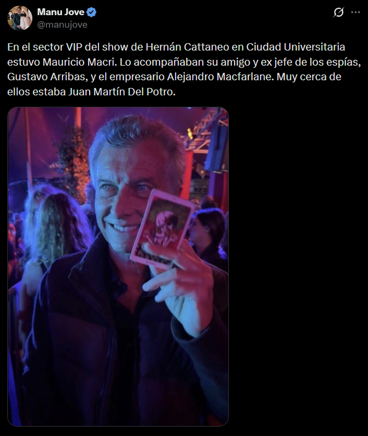 En medio de esta reactivación política, el ex presidente también mostró un costado más distendido. El sábado asistió a una fiesta electrónica en Buenos Aires del DJ Hernán Cattaneo, acompañado por Gustavo Arribas, ex titular de la AFI durante su gestión. No fue un hecho aislado: desde su separación de Juliana Awada, Macri también se dejó ver en otros eventos públicos, como el recital de Soda Stereo en el Movistar Arena el mes pasado.