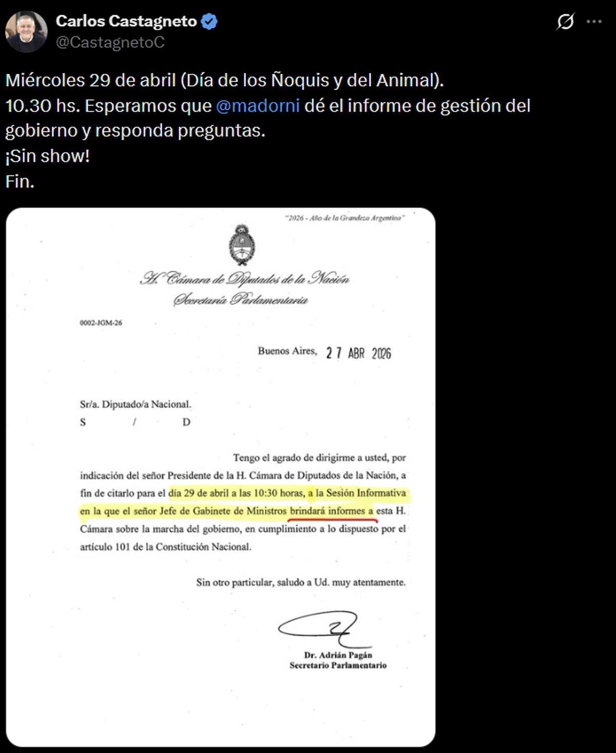 La convocatoria fue oficializada este lunes por el secretario Parlamentario, Adrián Pagán, y fijada para este miércoles 29 a las 10.30. No será una presentación más. El propio presidente Javier Milei confirmó que estará presente para respaldar a su funcionario: