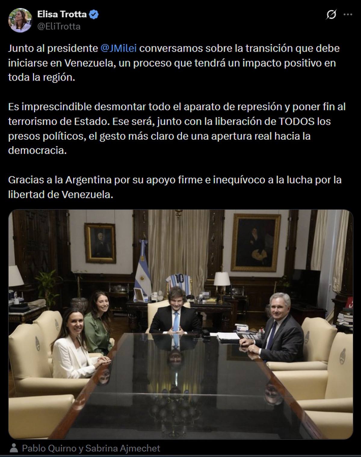 La protagonista fue Elisa Trotta, activista y una de las voces más visibles del antichavismo en América Latina, que visitó el despacho presidencial junto a un grupo de asesores para discutir el escenario post-Maduro después de la captura del expresidente venezolano en una operación de fuerzas militares estadounidenses.