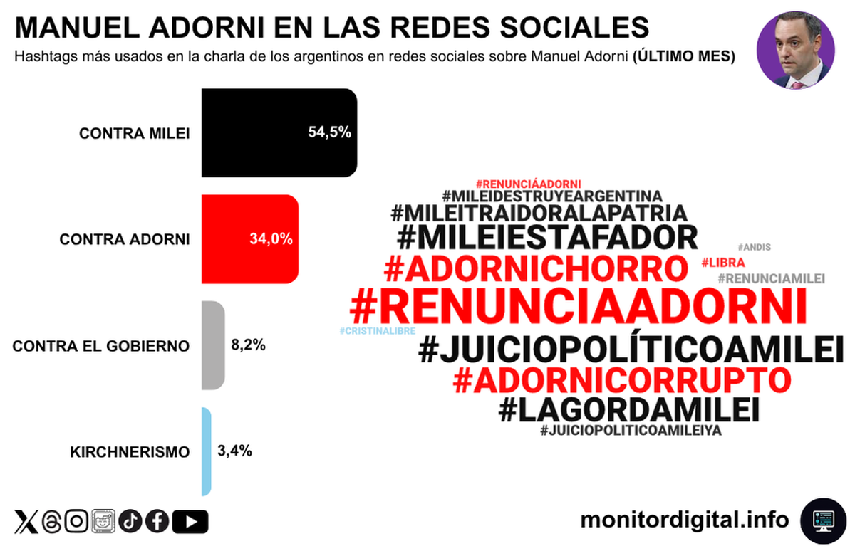 "Que el bloque “Contra Milei” represente 54,5% de los hashtags analizados durante el último mes y el bloque “Contra Adorni” 34% es una señal de presidencialización del costo. Esto significa que, en la percepción digital, Adorni aparece como una pieza íntimamente asociada al Presidente. La crítica no se detiene en él, sino que sube por el organigrama y golpea en lo más alto", sostiene el reporte.