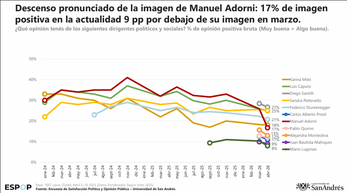 Según la línea histórica del sondeo, Adorni fue durante mucho tiempo la figura mejor valorada del Gabinete. Ahora es una de las más desprestigiada de la política.