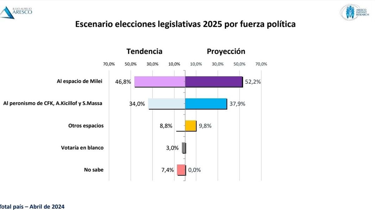 En el caso del sondeo de abril, y son datos que se viralizaron en las redes, un polo configurado en torno al oficialismo, denominado como "espacio de Milei", lidera con amplia ventaja sobre otro conglomerado asociado a CFK, Axel Kicillof y Sergio Massa. Es un escenario de intención de voto de cara a las elecciones legislativas del próximo año.