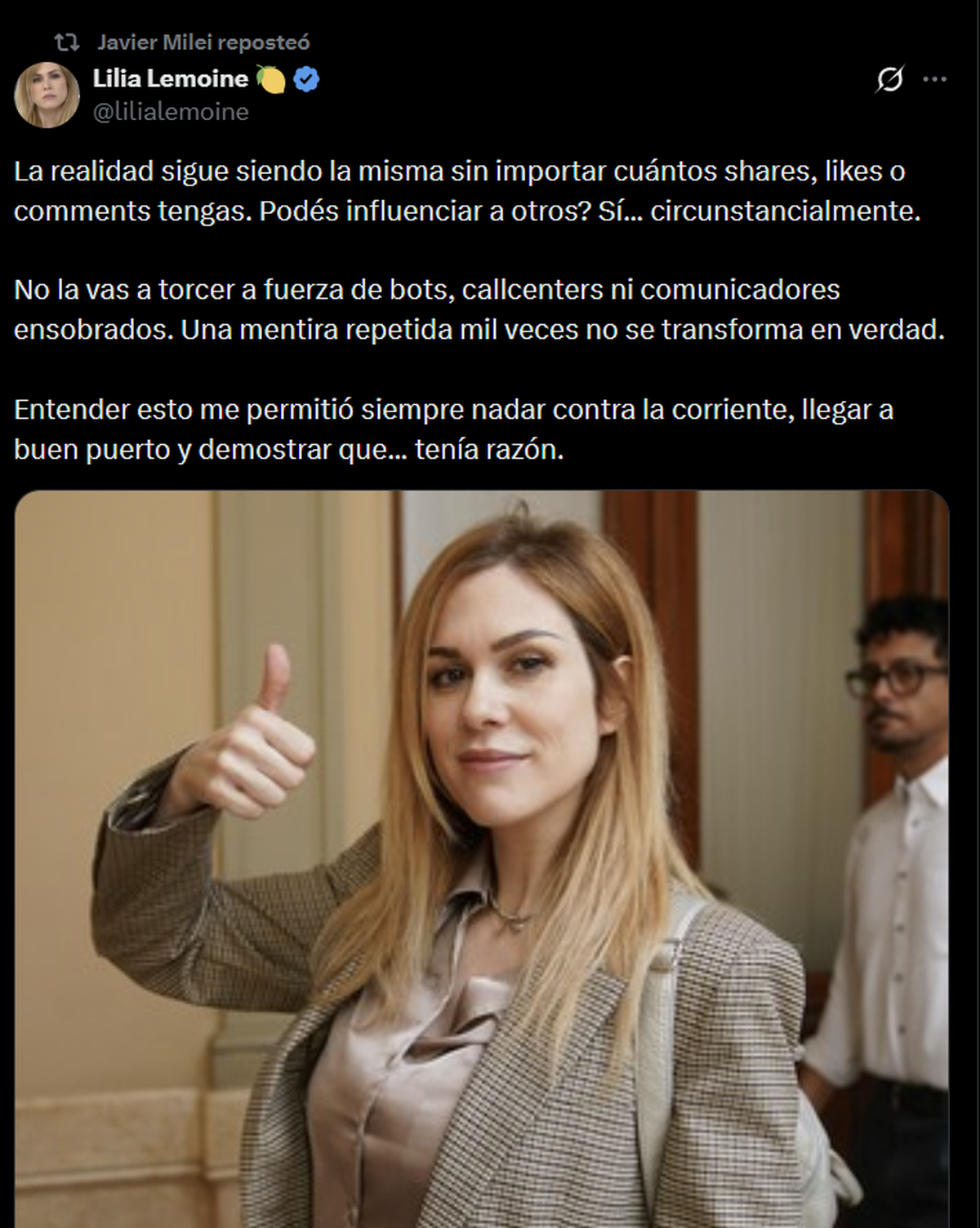 Con ese retuit, Milei no solo validó el mensaje de Lemoine, sino que también dejó implícita una crítica al peso que ciertos sectores digitales intentan tener dentro del armado político libertario.