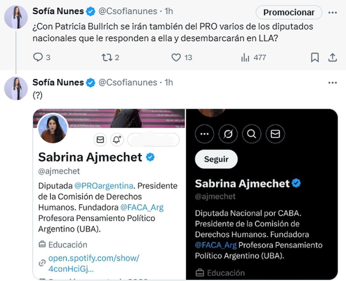 Por último, hubo diputados nacionales que ya dieron señales, como por ejemplo la legisladora nacional Sabrina Ajmechet, quien este mismo martes 06/05 ya eliminó de su biografía de redes sociales el nombre del partido al que todavía pertenece (el PRO) y prefirió acortar su cargo solamente a "diputada nacional por CABA".