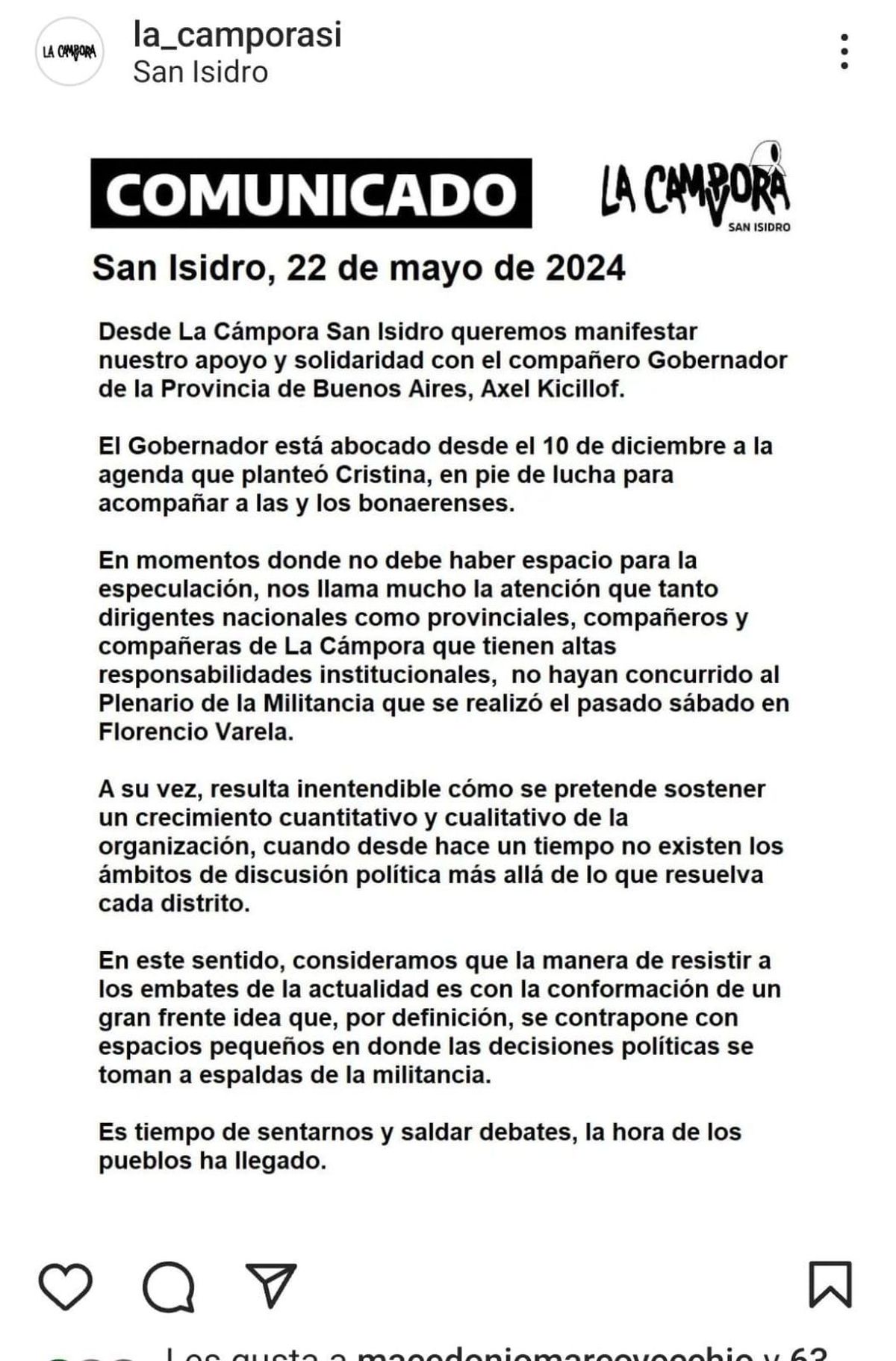 El comunicado fue difundido a través de las redes sociales, en el que la agrupación apuntó de lleno contra su principal líder y, además, se posicionó en la interna bonaerense con su "apoyo y solidaridad con el compañero Gobernador de la Provincia de Buenos Aires, Axel Kicillof”.