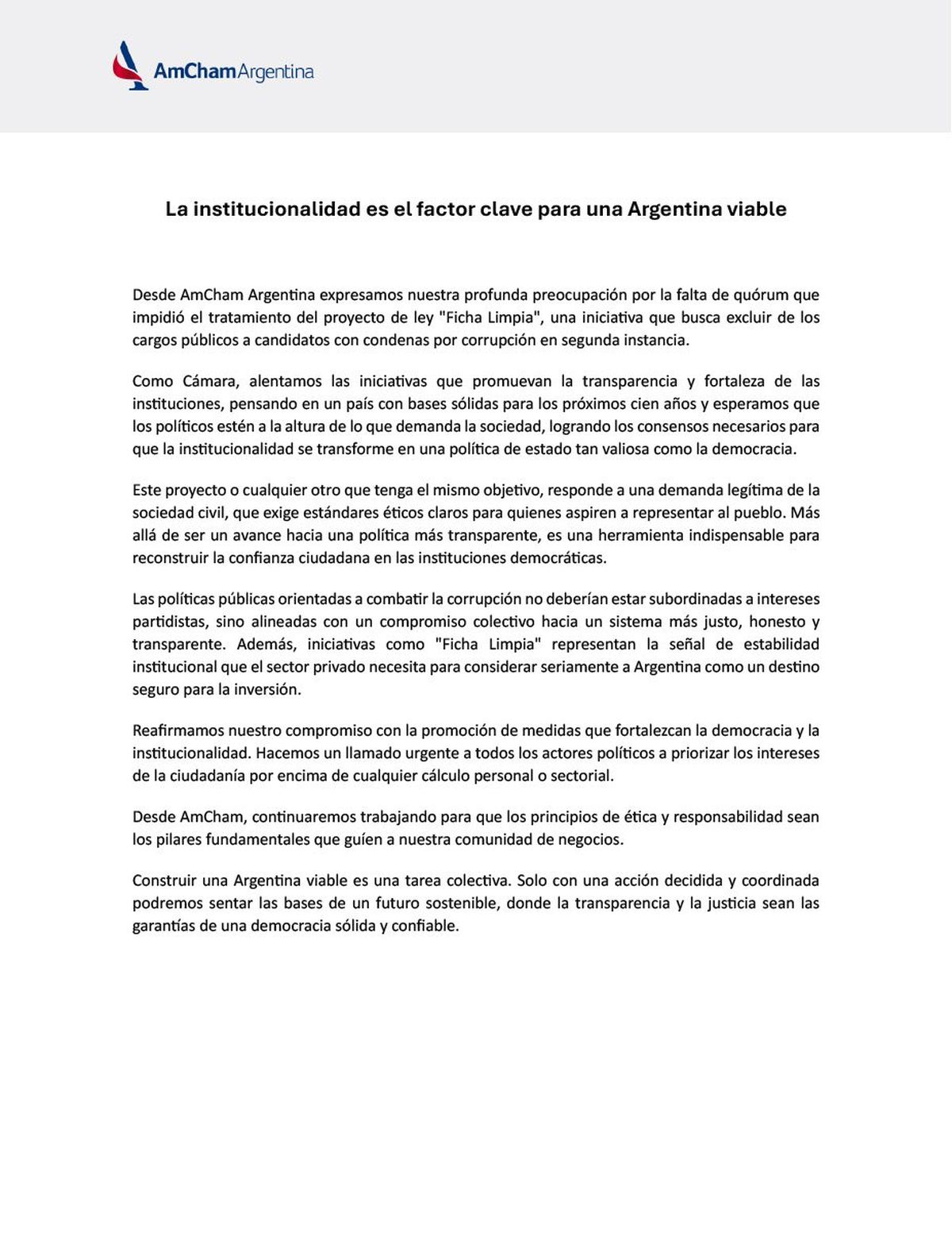 Con el título "La institucionalidad es el factor clave para una Argentina viable", desde AmCham Argentina emitieron el comunicado este viernes 29/11 al mediodía en el que expresaron una “profunda preocupación” por la falta de quorum que impidió el tratamiento de ficha limpia.